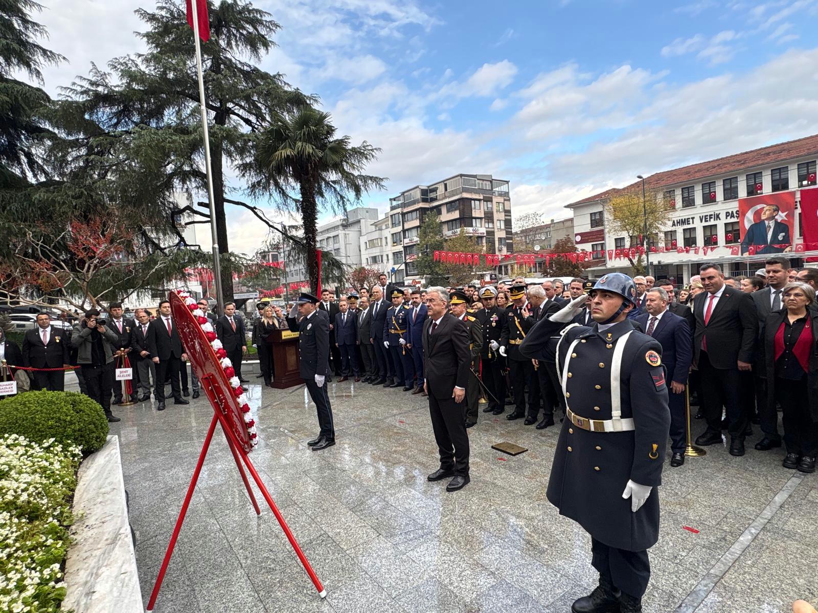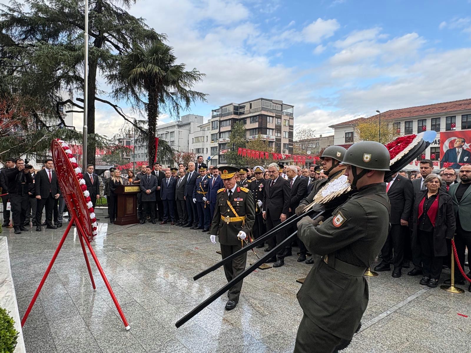 Garnizon Komutanlığı ve Bursa Büyükşehir Belediyesi tarafından anıta çelenklerin sunulmasının akabinde hürmet duruşunda bulunuldu ve İstiklal Marşı okundu.