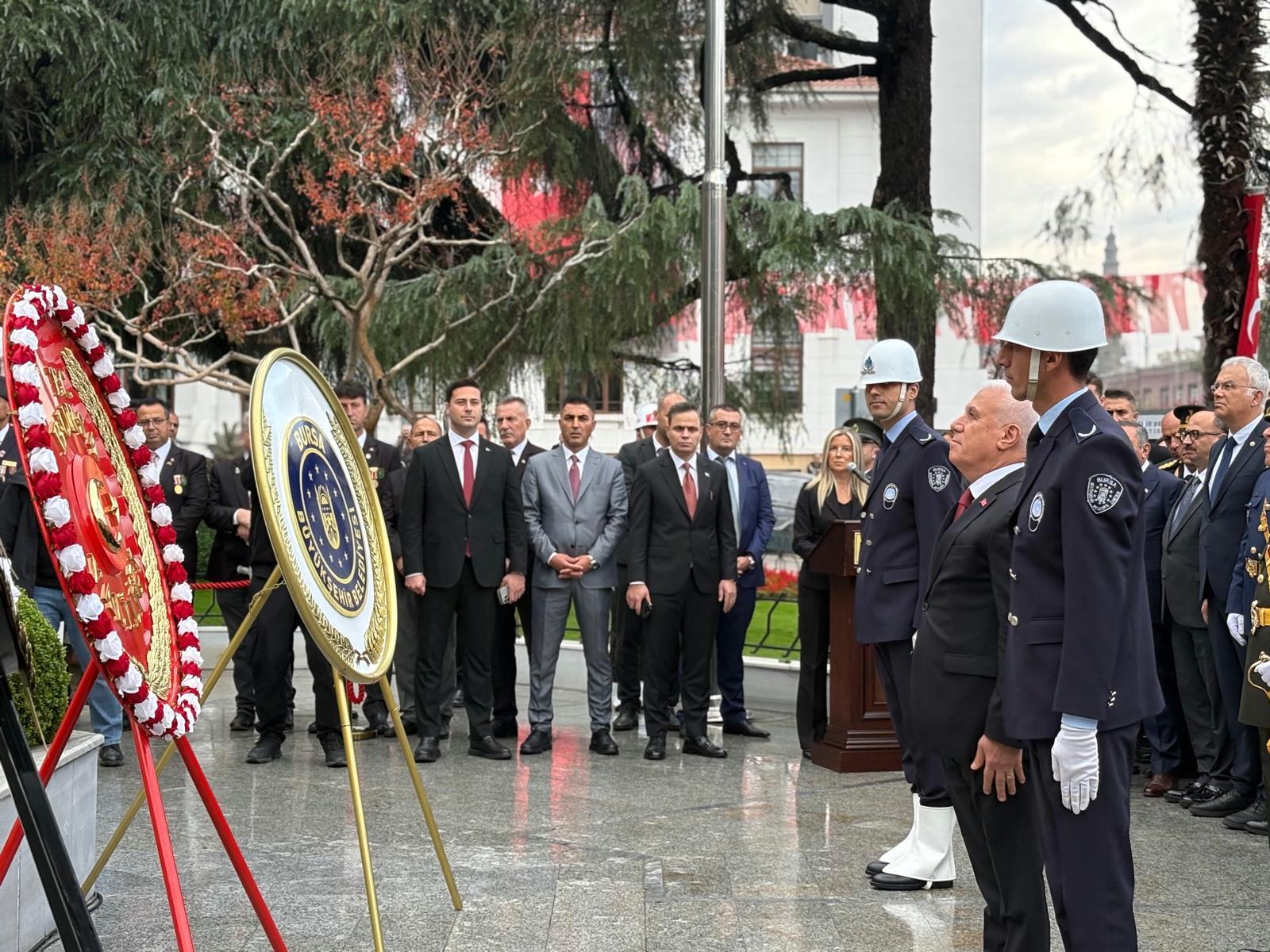Cumhuriyet’in 102. yılı kutlamaları Bursa’da bir gün evvelce başladı. 29 Ekim Cumhuriyet Bayramı öncesinde düzenlenen merasim kapsamında, Heykel’deki Atatürk Anıtı’na çelenk sunuldu.
