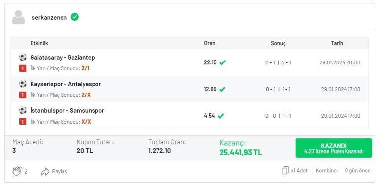 Misli üyelerinin Kupon paylaşımı ve yorum yaptığı aynı zamanda puanlar kazandığı Misli Arena’da, bir Misli kullanıcısı kuponunu diğer üyelerle paylaştı. Üye, Süper Lig pazartesi bülteninden seçtiği 3 maçtan oluşan 1.272 oranlı bir kupon oluşturdu.Kuponunda yer alan tüm karşılaşmalarda ‘ilk yarı/maç sonucu’ bahislerini tercih eden Misli üyesi böylece yalnızca 3 Maç eklemesine rağmen yüksek oranlı bir kupon yapmış oldu.Gündüz Maçlarında Tam İsabet!Misli üyesi, kuponuna Galatasaray – Gaziantep FK, Kayserispor – Antalyaspor ve İstanbulspor – Samsunspor karşılaşmalarını ekledi. İstanbulspor – Samsunspor mücadelesinde ilk yarı ve maç sonucu beraberliğini tercih eden kullanıcı ilk devre 0-0, karşılaşma da 1-1’lik skorla tamamlanınca ilk tahminini tutturmuş oldu. Üye, Kayserispor – Antalyaspor maçında ise ilk yarıyı konuk ekibin önde bitireceği ancak 90 dakikanın eşitlikle tamamlanacağı tahmininde bulundu. Sergen Yalçın’ın öğrencileri ilk devreyi önde tamamlasa da 61’de gelen gole engel olamayınca mücadele eşitlikle tamamlandı ve böylece kupondaki bir diğer tahmin de gelmiş oldu.89’da Gelen Golle Büyük Sevinç Yaşadı!Kuponda yer alan ve en yüksek oranı veren son tercihinde ise Misli üyesi Galatasaray – Gaziantep FK maçında ilk yarıyı konuk ekibin önde bitireceği ve mücadeleyi Galatasaray’ın kazanacağı iddiasında bulundu. Maçın ilk devresini Gaziantep FK 1-0’lık skorla önde tamamladı. İkinci yarıda baskısını artıran ev sahibi Sarı-Kırmızılılar önce eşitliği yakaladı ardından 89. dakikada Barış Alper’in ayağından gelen golle 3 puanı alan taraf oldu. Bu golle beraber kuponundaki 22.15 oranlı son tercihi de tutan Misli üyesi büyük sevinç yaşadı.Misli üyesi böylece 20 TL yatırdığı kuponla tam 25.441 TL kazanmış oldu. Üye, bu kuponuyla Misli Arena’da günün “En İyi 20” kuponu arasında yer aldı.Eğer ben daha iyisini yaparım diyorsanız Misli’ye üye olarak Misli Arena’da kuponlarınızı paylaşabilir, iddaa bilginizi konuşturarak “Krallar” arasındaki yerinizi alabilir ve Arena puanları kazanabilirsiniz.İşte Misli üyesinin Misli Arena’da hem kazandığı hem de kazandırdığı o kupon…