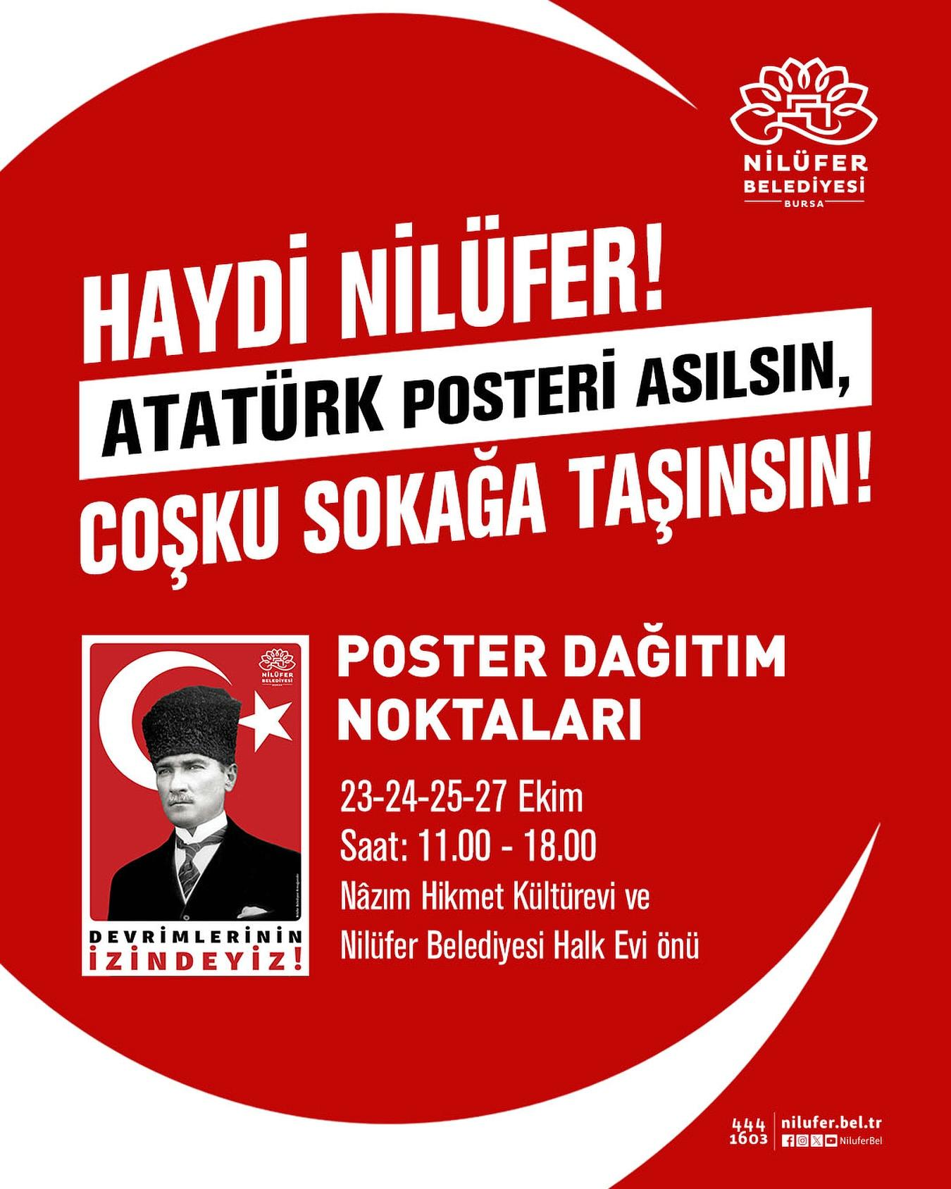Nilüfer Belediyesi, bu bayramda da geleneği bozmayarak binlerce Atatürk posterini vatandaşlarla buluşturacak. Ulu Önder’in posterleri, 23, 24, 25 ve 27 Ekim tarihlerinde Nilüfer Belediyesi Halk Meskeni önü ve Nazım Hikmet Kültürevi’nden fiyatsız olarak temin edilebilecek.