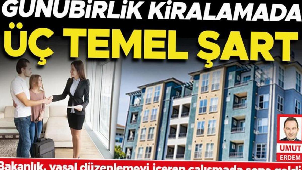 KONAKLAYANLARIN BİLGİLERİEvini günlük kiralamak isteyen ev sahibi, konaklayan kişileri düzenli olarak bildirmekle yükümlü olacak. Böylece evlerin yasa dışı olarak kullanılmasının önüne geçilecek. Ev sahibi kiralamayı yapan kişinin kimlik bilgileri ve konaklama sürelerini Emniyet’e ibraz etmek zorunda olacak. Bu uygulama için de e-devlet üzerinden bir ara yüz açılması planlanıyor. Bu bilgileri vermeyen ev sahiplerine ise cezai yaptırım getirilmesi öngörülüyor.LEVHA ASMAK ZORUNLUÜçüncü temel şart ise istenilen belgeleri tamamlayan ev sahiplerinden kapılarına levha asmaları istenecek. Asılacak levha ile o evde günübirlik kiralama yapıldığı ortaya konulacak. Teklifin yasalaşması halinde kurallara uymayan ev sahiplerine de 1 milyon TL’ye varan cezai yaptırımların uygulanması planlanıyor. Ayrıca belgelerin tamamlanmaması, kiralamanın da devam ettiğinin tespit edilmesi halinde ev mühürlenecek.VERGİ DÜZENLEMESİHazırlıkları süren yeni mevzuatta ev sahiplerinden yangın merdiveni, yangın raporu belgesi, atıkların kontrolü belgesi gibi izinleri almaları, ev içerisinde havlu, saç kurutma makinesi ve nevresim takımı gibi zorunlu eşyaları bulundurmalarının isteneceği belirtiliyor. Buradan elde edilen gelirle ilgili bir vergi düzenlemesi yapılacağı da yine çalışmada yer alan konular arasında.