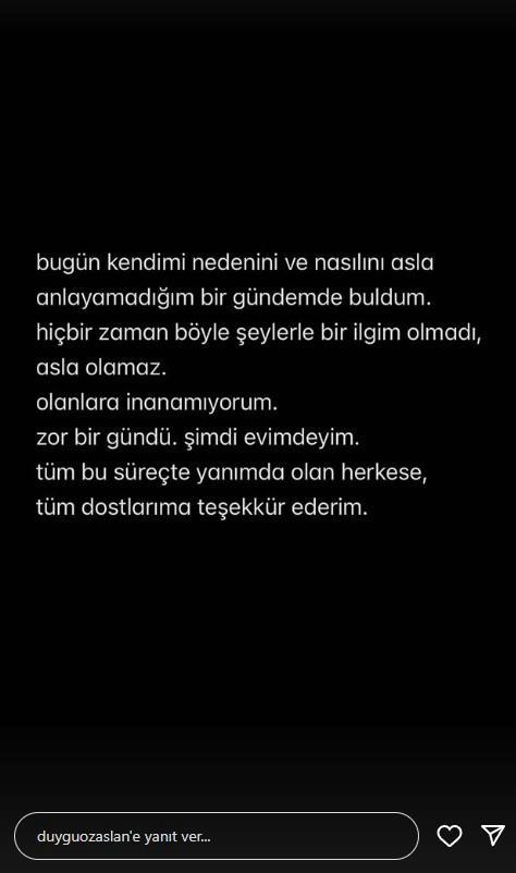 Soruşturma kapsamında söz veren isimlerden biri olan influencer His Özaslan, meskenine döndükten kısa müddet sonra toplumsal medya hesabından bir açıklama paylaştı. Özaslan paylaşımında şu tabirlere yer verdi, "Bugün kendimi nedenini ve nasılını asla anlayamadığım bir gündemde buldum. Hiçbir vakit bu türlü şeylerle bir ilgim olmadı, asla olamaz. Olanlara inanamıyorum. Sıkıntı bir gündü, artık evimdeyim. Tüm bu süreçte yanımda olan herkese, tüm dostlarıma teşekkür ederim."