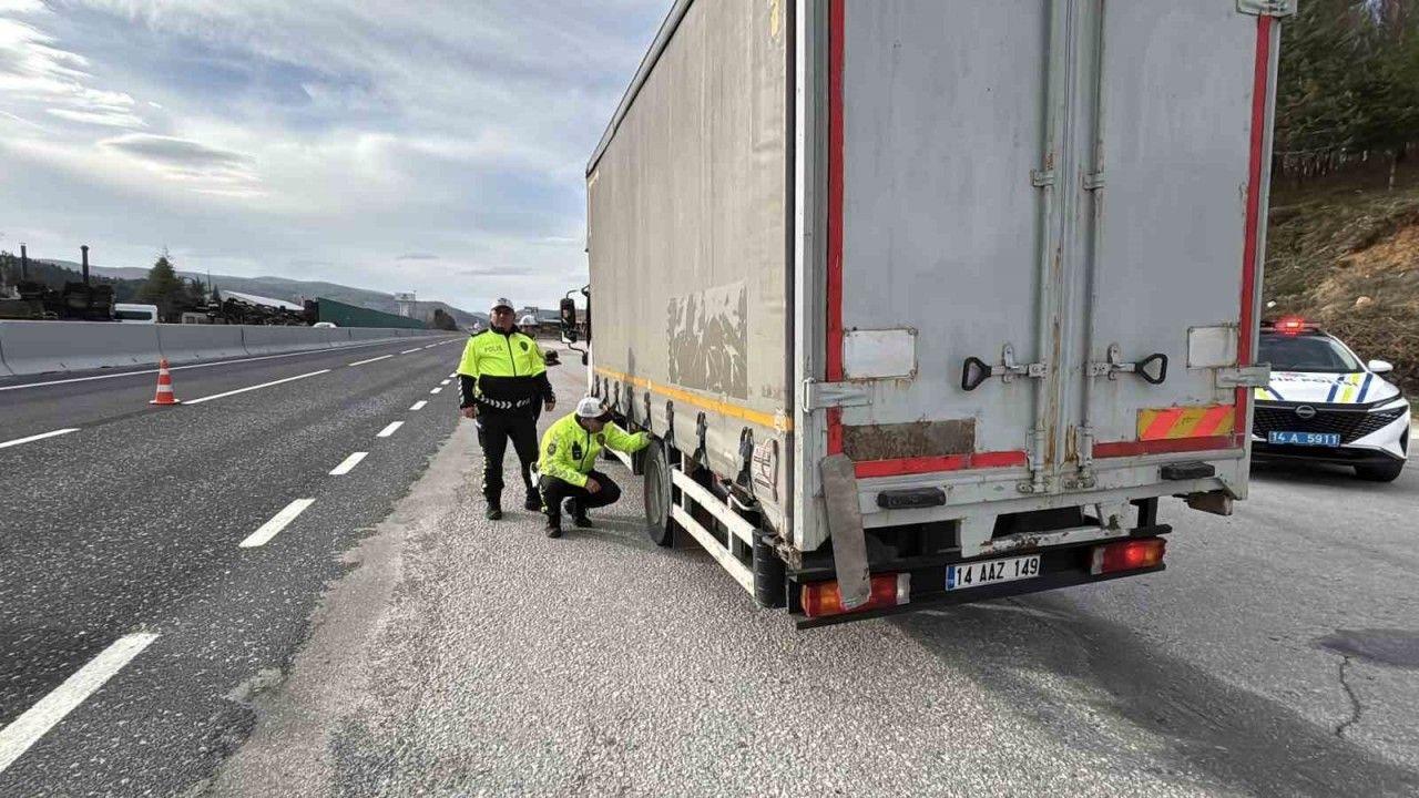 Türkiye’nin en kıymetli geçiş noktalarından biri olan Bolu Dağı geçişinde polis takımları, kış lastiği uygulaması yaptı. Kurallara uymayan şoförlere 5 bin 859 lira para cezası uygulandı.Bolu İl Emniyet Müdürlüğü Bölge Trafik Denetleme Şube Müdürlüğü takımları D-100 kara yolunun Bolu geçişinde tedbirlerini artırdı. İstanbul ile Ankara ortasında köprü vazifesi gören D-100 kara yolunun Bolu Dağı girişinde polis grupları uygulama noktası oluşturdu. Takımlar tarafından hafif ticari araç, kamyon, tır ve yolcu otobüslerine yönelik kış lastiği kontrolü yaptı. Kış lastiği olmayan araç şoförlerine ise 5 bin 859 lira para cezası uygulandı.