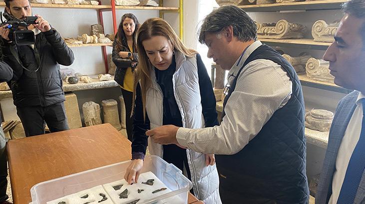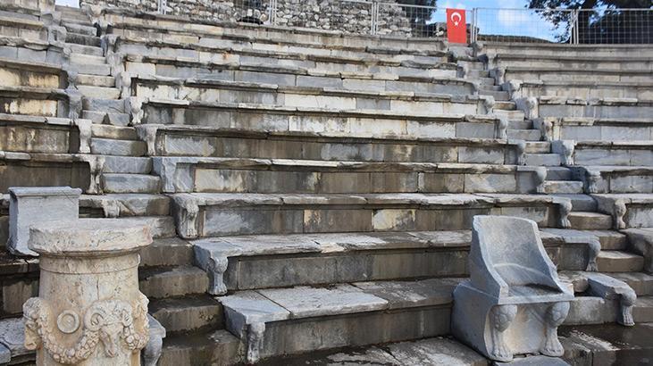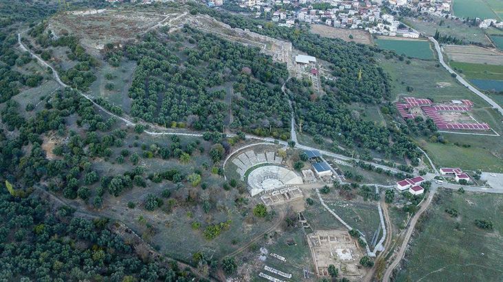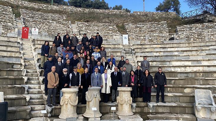 'ÇOK ÖNEMLİ BULUNTULAR ORTAYA ÇIKTI'Metropolis'in İyonya'nın çok önemli bir Kenti olduğunu belirten Prof. Dr. Aybek, sözlerini şöyle sürdürdü:"Çok bereketli toprakları kendisine sınır olarak almış bir kent. Burada özellikle tarım öne çıkıyor. Hemen önünden geçen Menderes Nehri'nin bereketiyle bu tarım ürünlerini Eski Çağ dünyasında farklı yerlere gönderebiliyor ve buradan da zenginleşiyor. Bugün Metropolis'in harabelerini gezdiğimizde o zenginliği, güzel mermer yapıları görebiliyoruz ve o günün şaşasını anlayabiliyoruz. Metropolis'te her zaman sürprizlerle karşılaşıyoruz. Yamaçta kurulmuş bir kent olduğu için genellikle kalıntılar derin alüvyal dolgular altında ortaya çıkıyor. Yeni çalıştığımız alanda toprak üzerinde görülen çok fazla bir şey bulunmamasına karşın arkeolojik kazıların sonucunda çok önemli buluntular ortaya çıktı. Yerinde korunmuş olan sütunlar, ayakta durumda tuğla dükkanlar bulundu. Heyecanla önümüzdeki yıllardaki çalışmaları bekliyoruz."'SU BASKINLARINA KARŞI ÖZEL BİR TAHLİYE SİSTEMİ VAR'DEÜ Rektörü Prof. Dr. Nükhet Hotar ise "Emekli Sayın Recep Meriç hocamız 1990 yılında bu yapının, bu buluntunun varlığını keşfetmiş ve kazı çalışmalarını başlatmış. Yaklaşık 30 yıl süren bir geçmişten sonra bir süre ara verilmiş hocamızın emekli olmasından itibaren daha sonra bizim kadromuza aldığımız Serdar Hocamızdan sonra tekrar Sayın Cumhurbaşkanımızın da imzasıyla bu kazıyı yapma yetkisi üniversitemize verildi ve iki yıldır devam ettirmekteyiz. Antik kent çok kıymetli. Ülkemizin her bir taşı çok kıymetli. Bu kentin, bu tiyatronun hiç bozulmadan neredeyse orijinal olarak bulunmuş olması çok değerli. Konunun uzmanı hocalarımız özellikle su baskınlarına karşı çok özel bir su tahliye sisteminin olduğunu anlattı. Kentin diğer bölümlerinde özellikle konut olarak kullanılan villaların zemininde halı yerine adeta yapılmış çok kıymetli mozaikler var. Mozaiklerde genelde erkek ve kadın figürü ve birbirine bakar vaziyette. Biz onları evin sahipleri olarak düşündük. Hocalarımız öyle olabileceğini anlattı" dedi.'MÜMKÜN OLAN EN ÜST DÜZEYDE KORUMAYA ÇALIŞIYORUZ'Ayrıca antik kentin önemli bir ticaret üssü olarak da kullanıldığını belirten Prof. Dr. Hotar, "Bizim bundan sonraki hedefimiz ulusal ve uluslararası akademik çalışmalar yapmak. Burası adeta açık hava laboratuvarı gibi çok kıymetli verilerimiz var. İlk kazmanın vurulması üniversitemize ait olan bir kazı. Mümkün olan en üst düzeyde korumaya çalışıyoruz. Kaymakamımızın da öncülüğünde bir yine proje kapsamında ilkokul çocuklarımızın gelip burada çeşitli deneyimler elde etmesi söz konusu. Bizim hedefimiz çocuklarımızı, gençlerimizi bu bilinçle yetiştirerek geleceğe hazırlamak. Burası maalesef turistik olarak çok fazla turistin geldiği veya konuyla ilgili bilim insanlarının ziyaret ettiği veya haberdar olduğu bir yer değil. Bunu yıllık verilerden görüyoruz. Burada da basının duyurulma noktasındaki çabası, buradaki bu güzelliklerin dünya çapında daha çok duyurulması, daha çok araştırmacının ve turistin buraya gelmesi hem konuyla ilgili araştırmaların artması hem ilçeye, ülkeye veya şehrimize bir bunun ticari faaliyet olarak da kısmen yansıması çok kıymetli" diye konuştu.