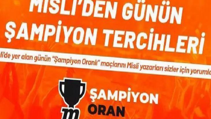 Misli’de yer alan günün “Şampiyon Oranlı” maçlarını Misli yazarları sizler için yorumladı. Siz de “Şampiyon Oran” farkıyla Misli’de maçların heyecanını daha yüksek oranlarla yaşayabilirsiniz. İşte günün şampiyon tercihleri…