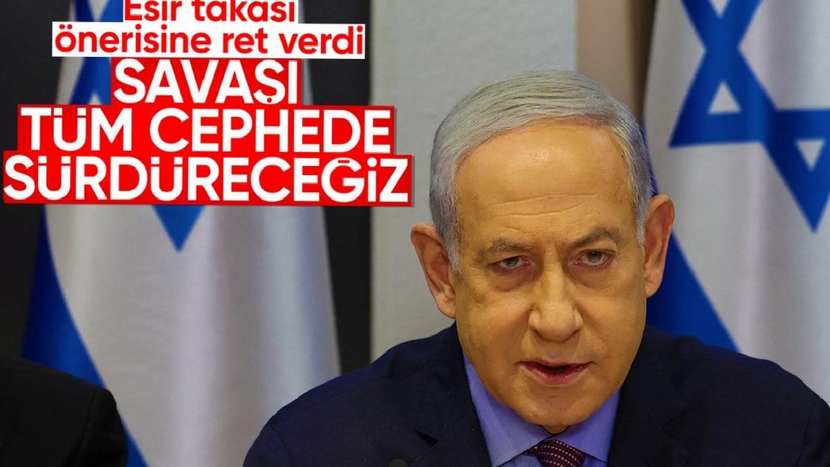 İsrail 7 Ekim'den beri abluka altındaki Gazze Şeridi'ne yönelik saldırılarını sürdürüyor.25 bini aşkın sivili katleden İsrail, sivil yerleşim yerlerine yaptığı saldırılar ile katliamlarına her geçen gün yenilerini katıyor.İsrail tarafından, savaşın devam edeceğine yönelik açıklamalar da gelmeye devam ediyor.Hamas'ın 'savaşın sona ermesi 'teklifini reddettiİsrail Başbakanı Binyamin Netanyahu, yayınladığı görüntülü açıklamada, şu ana kadar 110 esiri geri getirdiklerini ve tamamını geri getirmeye kararlı olduklarını ifade ederek, "Hamas’ın teslim olma şartlarını" reddettiğini söyledi.Esirlerin serbest bırakılması karşılığında Hamas’ın savaşın sona ermesi ve İsrail güçlerinin Gazze’den ayrılması taleplerinin olduğunu belirten Netanyahu, bunu kabul etmeleri halinde "askerlerin boşuna ölmüş olacağını, vatandaşların güvenliğinin garanti altına alınamayacağını ve bir başka 7 Ekim’in an meselesi olacağını" savundu."Savaşı tüm cephe ve sektörde sürdürüyoruz"Netanyahu, "Savaşı tüm cephe ve sektörde sürdürüyoruz. Hiçbir teröriste dokunulmazlık vermiyoruz. Ne Gazze’de ne Lübnan’da ne Suriye’de ne de başka bir yerde. Kim bize zarar vermeye çalışırsa ona zarar veririz." ifadelerini kullandı.Gazze'deki İsrailli esirlerHamas'ın askeri kanadı İzzeddin el-Kassam Tugayları, "Filistinlilere ve başta Mescid-i Aksa olmak üzere kutsal değerlere yönelik sürekli ihlallere karşılık verme" gerekçesiyle İsrail'e 7 Ekim 2023'te kapsamlı saldırı düzenlemiş, çok sayıda İsrailli Esir alınmıştı.Gazze’deki çatışmalara 24 Kasım 2023'te 4 günlüğüne verilen ve daha sonra 3 gün uzatılan "insani arada" 81 İsrailli ve 240 Filistinli esir karşılıklı serbest bırakılmıştı.