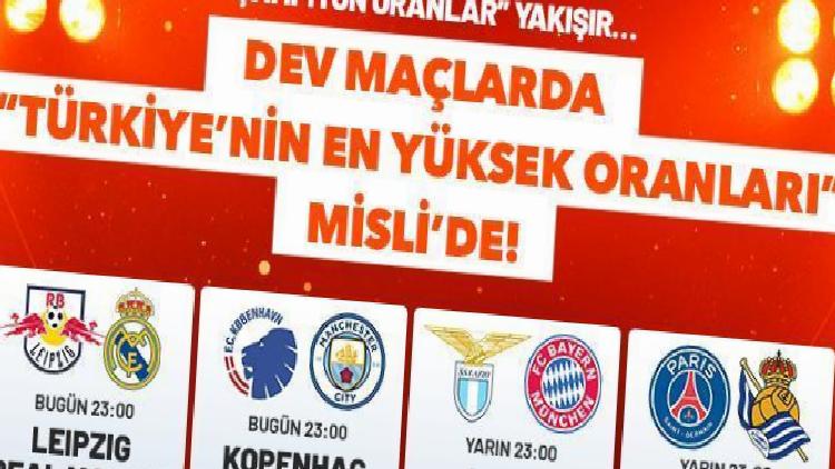 Üyelerine yenilikler sunmaya devam eden Misli, “Şampiyon Oran” kampanyası ile bültende yer alan pek çok maça normalin üzerinde oranlar sunuyor. Siz de hemen Misli uygulamasını indirin; “Şampiyonlar Ligi” maçlarına “Türkiye’nin En Yüksek Oranları” ile oynayarak daha fazla kazanma şansını yakalayın!Ayrıca sadece Misli’de yer alan “Canlı Sohbet” özelliği ile Misli üyeleri, maçlar oynanırken bir araya gelerek karşılaşmaları değerlendirebiliyor.Devler Ligi’nde son 16 turu bu hafta 4 maça sahne olacak. İşte program…Bugün23:00 Leipzig – Real Madrid23:00 Kopenhag – Manchester CityYarın23:00 Lazio – Bayern Münih23:00 Psg – Real SociedadMuhtemel 11’ler ve dev maçlarla ilgili iddaacılara özel öne çıkan istatistikler…Leipzig – Real Madrid· Leipzig’in bu sezon Şampiyonlar Ligi gruplarında oynadığı 6 Maç da “Karşılıklı Gol Var” ve “2.5 Üst” bitti.· Leipzig’in Şampiyonlar Ligi’nde evinde oynadığı son 10 maçın hepsi “Karşılıklı Gol Var” bitti.· Real Madrid, bu sezon Şampiyonlar Ligi gruplarında oynadığı tüm maçları kazandı.· Real Madrid, son 3 Şampiyonlar Ligi maçında en az “3” gol attı.· Real Madrid’in son 5 Şampiyonlar Ligi maçı “2.5 Üst” bitti.· Leipzig ile Real Madrid arasında geçen sezon Almanya’da oynanan grup maçında 5 gol çıktı. (Leipzig 3-2 Real Madrid)Leipzig: Gulácsi – Simakan, Klostermann, Orban, Raum – Xavi, Schlager, Kampl, Olmo – Sesko, OpendaReal Madrid: Lunin – Vázquez, Carvajal, Nacho, Mendy – Valverde, Tchouameni, Kroos – Modric – Vinícius, RodrygoMisli’de; “Şampiyon Oran” farkı ile Leipzig’in oranı 2.60’tan 2.77’ye, Real Madrid’in oranı 1.93’ten 2.06’ya, beraberliğin oranı ise 3.33’den 3.54’e yükselmiş durumda.Kopenhag – Manchester City· Kopenhag, Şampiyonlar Ligi’nde evinde oynadığı son 2 maçı kazandı.· Kopenhag ile Manchester City arasında Kopenhag’ın sahasında oynanan 2 maç da beraberlikle sonuçlandı.· Kopenhag, geçen sezon Şampiyonlar Ligi gruplarında oynanan 2 maçta da rakibine gol atamadı.· Manchester City, bu sezon Şampiyonlar Ligi gruplarında oynadığı tüm maçları kazandı.· Manchester City, bu sezon Şampiyonlar Ligi gruplarında oynadığı maçların her birinde “3” gol attı.· Manchester City, Şampiyonlar Ligi’nde 19 maçtır kaybetmiyor.Kopenhag: Grabara – Ankersen, Vavro, Diks, Jelert – Hojlund, Falk, Goncalves – Elyounoussi, Claesson, AchouriManchester City: Ederson – Walker, Dias, Akanji, Gvardiol – Rodri, De Bruyne Silva, Alvarez, Foden – HaalandMisli’de; “Şampiyon Oran” farkı ile Kopenhag’ın oranı 10.95’ten 11.61’e, Manchester City’nin oranı 1.08’dan 1.15’e, beraberliğin oranı ise 5.60’tan 5.95’e yükselmiş durumda.Lazio – Bayern Münih· Lazio, sahasında oynadığı son 12 Avrupa maçının sadece 1’ini kaybetti.· Lazio’nun bu sezon Şampiyonlar Ligi gruplarında evinde oynadığı 3 maç da “2.5 Alt” bitti.· 2020 / 21 sezonunda yine Şampiyonlar Ligi son 16 turunda eşleşen Lazio ve Bayern Münih arasındaki 2 maç da “Karşılıklı Gol Var” ve “2.5 Üst” bitti.· Bayern Münih, Lazio ile karşılaştığı 2 maçta da rakibini mağlup etti.· Bayern Münih, Şampiyonlar Ligi’nde oynadığı son 8 deplasman maçının 7’sini kazandı.· Bayern Münih’in son 5 Şampiyonlar Ligi maçı “İlk Yarı Sonucu 0” bitti.· Bayern Münih, Şampiyonlar Ligi’nde kazandığı son 6 maçın 5’ini tek farklı kazandı.Lazio: Provedal – Lazzari, Gila, Romagnoli, Marusic – Guendouzi, Rovella, Alberto – Isaksen, Immobile AndersonBayern Münih: Neuer – Mazraoui, Upamecano, Kim Min Jae, Guerreiro – Kimmich, Goretzka, Müller, Musiala, Sané – KaneMisli’de; “Şampiyon Oran” farkı ile Lazio’nun oranı 4.26’dan 4.54’e, Bayern Münih’in oranı 1.47’den 1.57’ye beraberliğin oranı ise 3.50’den 3.72’ye yükselmiş durumda.PSG – Real Sociedad· PSG’nin bu sezon Şampiyonlar Ligi gruplarında evinde oynadığı 3 maç da “2-3 Gol” aralığında bitti.· PSG, Şampiyonlar Ligi’nde evinde oynadığı son 11 maçın sadece 1’ini kaybetti ve 8’ini kazandı.· PSG’nin bu sezon Şampiyonlar Ligi gruplarında evinde oynadığı 3 maçın da ilk yarısı “1.5 Alt” bitti.· PSG’nin son 3 Şampiyonlar Ligi maçı “Karşılıklı Gol Var” bitti ve PSG son 3 maçını kazanamadı.· Real Sociedad’ın bu sezon Şampiyonlar Ligi gruplarında oynadığı 5 maç 2.5 alt biterken; deplasmanda oynadığı 3 maç da 2.5 alt bitti.· Real Sociedad bu sezon Şampiyonlar Ligi gruplarında oynadığı 6 maçı da kaybetmedi.· Real Sociedad bu sezon Şampiyonlar Ligi gruplarında sadece 2 gol yedi, deplasmanda ise hiç gol yemedi.PSG: Donnarumma – Hakimi, Marquinhos, Danilo, Hernandez – Ugarte, Zaïre Emery, Vitinha – Mbappé, Dembélé, BarcolaReal Sociedad: Remiro – Traore, Zubeldia, Le Normand, Javi Galán; Zubimendi – Kubo, Merino, Zakharyan, Oyarzabal – André SilvaMisli’de; “Şampiyon Oran” farkı ile PSG’nin oranı 1.47’den 1.57’e, Real Sociedad’ın oranı 4.55’ten 4.84’e beraberliğin oranı ise 3.31’den 3.53’e yükselmiş durumda.*Oranlar değişiklik gösterebilir.Misli’den yeni üyelere 50 TL hediye!Misli’ye üye olan herkes, 50 TL değerinde Misli Puan kazanıyor. Siz de mobil uygulamadan Misli’ye üye olun, kampanyaya katılın, anında 50 TL kazanın ve Şampiyonlar Ligi’nin heyecanını daha yüksek oranlarla yaşayın!